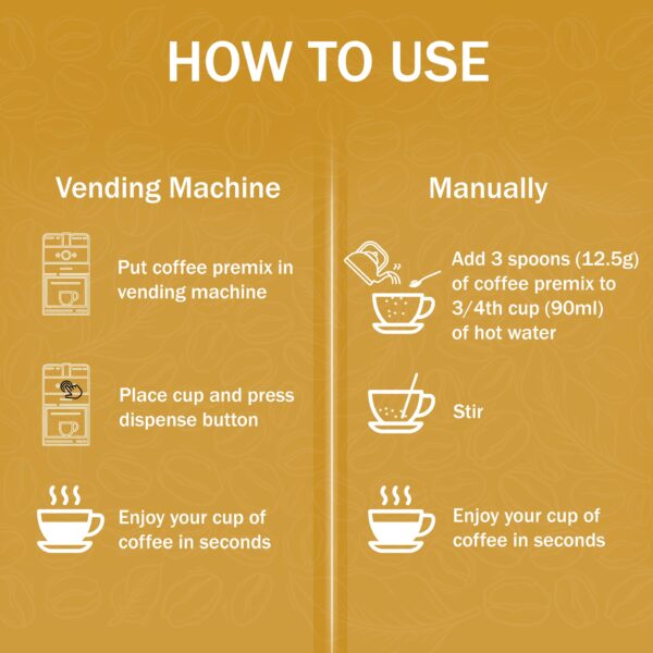 • Instruction For Use: Dispense 12.5 g of Premix along with 90 ml hot water through a vending machine or mix manually.