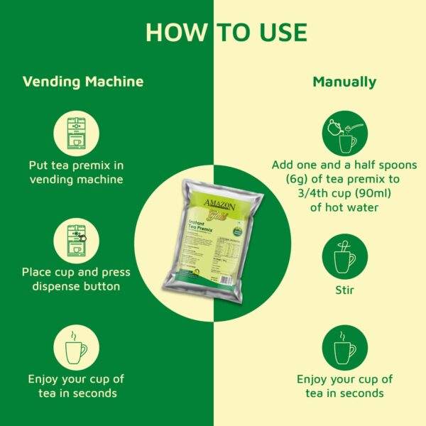 • Instruction For Use: Dispense 6 g of Premix along with 90 ml hot water through a vending machine or mix manually.