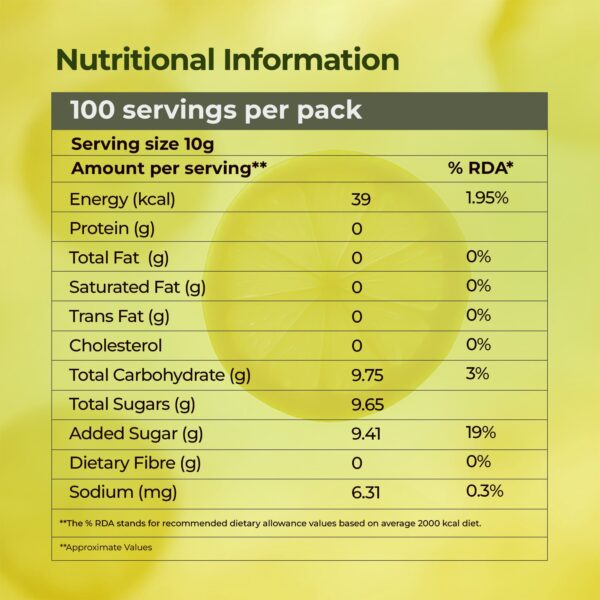 • Ingredients: Sugar, Instant Tea Powder (3.0%), Acidity Regulators (E 330 & E 331) and Lemon Flavour