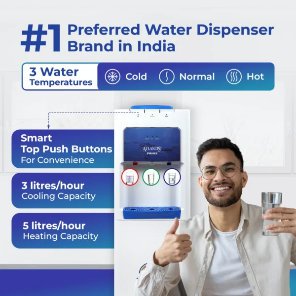 With its sleek design Atlantis Prime Floor Standing Water dispenser adds a touch of sophistication to your space. It offers three options normal, hot and cold water - catering to diverse drink preferences. It has top mounted buttons for water dispensing which eliminates the need for bending. This type of dispenser is perfect for use in households, offices, or other commercial settings where clean and safe drinking water is necessary. It provides a convenient and user-friendly way to get hot or cold water instantly without having to wait for water to heat on stove or chill in a refrigerator.
