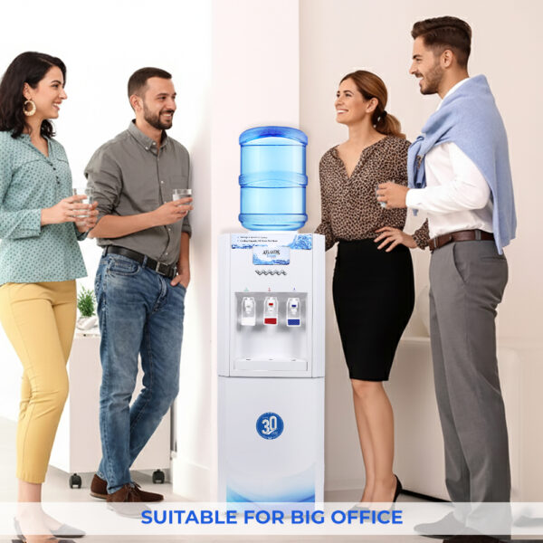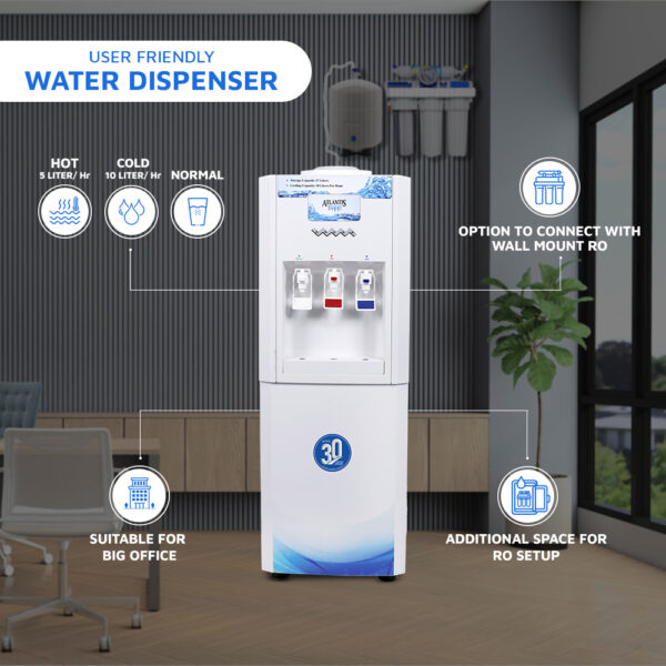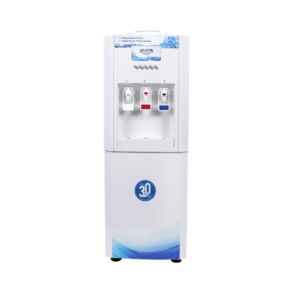 Quench your thirst with the Atlantis Super Floor Standing Water Dispenser. It is a super capacity water dispenser with RO compatibility for enhanced purity and offers hot, cold, and room temperature water options.