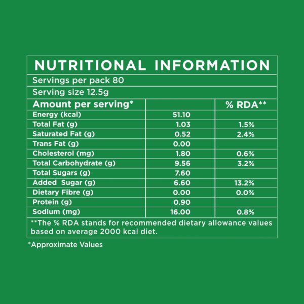 • Ingredients: Sugar, Beverage whitener {Skimmed Milk Powder, Edible Vegetable Oil, Dried Glucose, Milk Solids, Sugar, Emulsifier (E 471, E 481 (i) & E 320) }, Dairy Whitener (Milk Solids & Sugar), Maltodextrin, Instant Tea Powder (4.5%) and Cardamom Powder.
